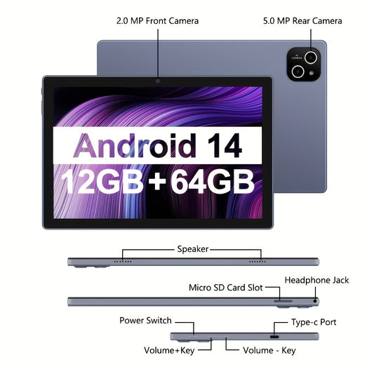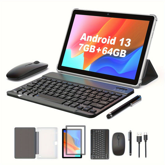 2-in-1 10.1" for Android Tablet with Keyboard, Mouse & Protective Case - Dual Cameras, Expandable for RAM (64GB+8GB), High-Definition Display, WiFi 5G, USB-C, Compatible with Google Play