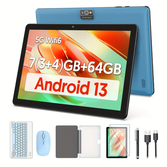 Android 13 Tablet, 10-Inch HD Large Screen, Quad-Core Processor, 7GB (3+4) RAM, 64GB Storage, Dual Camera (2MP+8MP), 1280*800 Resolution, with Keyboard, Mouse, Protective Case, 2-in-1 Functionality, Blue, Productivity Tool | Modern Gadget | Compact Design