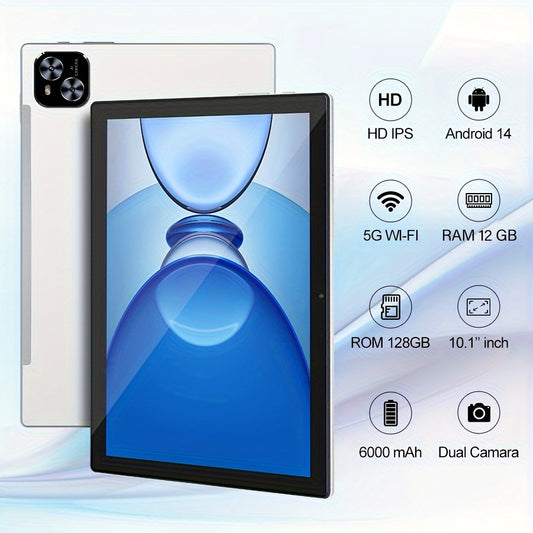 Android 14 Tablet - 10.1" 1280x800 IPS HD Display, 12GB RAM, 128GB ROM, Octa-Core, Dual Camera, 5G WiFi 6, GMS Certified, Titanium Alloy Body, Portable